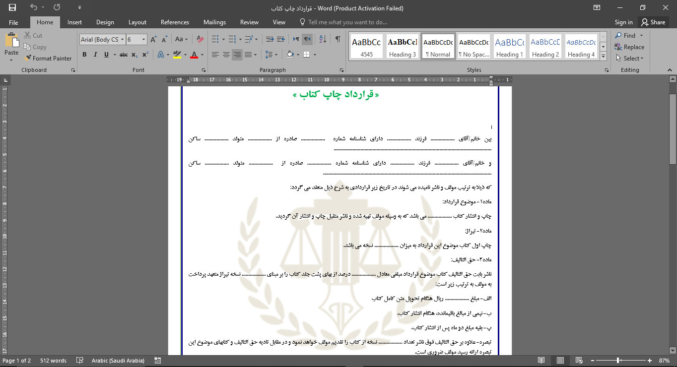 • شامل بندهای کلیدی درباره حق انتشار، تیراژ، هزینه‌ها و مسئولیت‌های طرفین