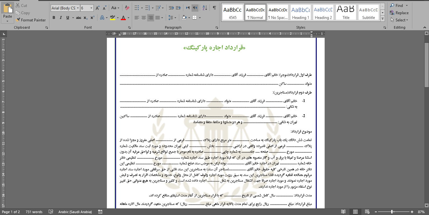 • شامل بندهای کامل درباره مدت اجاره، مبلغ، محل پارکینگ و شرایط فسخ